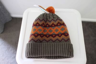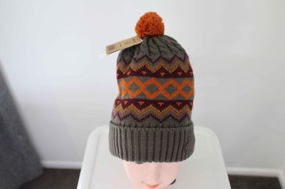 Knitted design and an orange pom pom. Fully lined in a soft polar fleece with minimal seam for comfortable wearing. Knitted rolled hem.